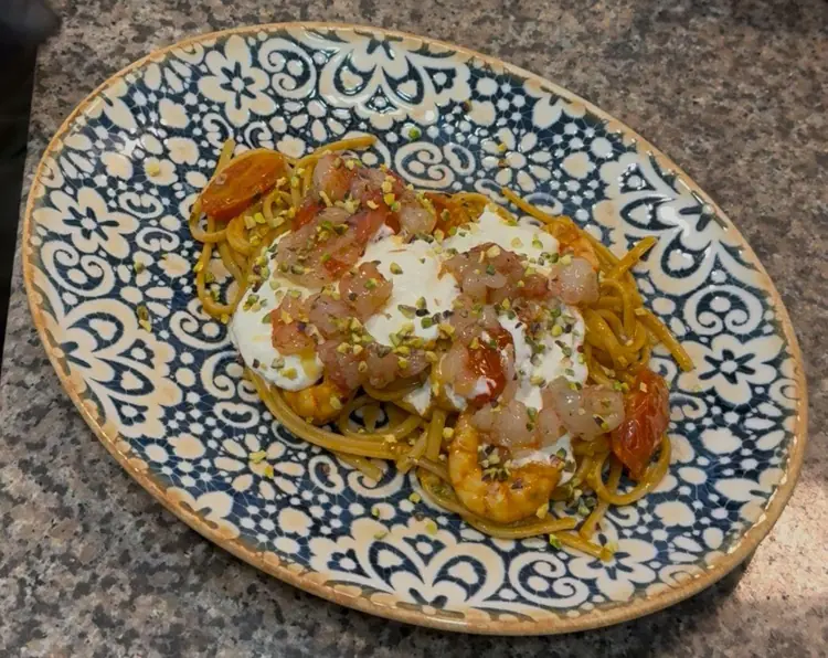 Tallarines con bisqué de gambas, pistacho, crema stracciatella y tartare de gambas .