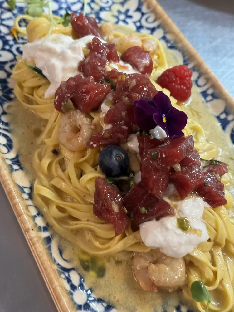 Tallarines artesanales con mantequilla, cola de gambas, lima , menta fresca y tartar de atun rojo de almadrava.