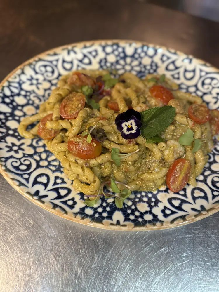 Pasta artesanal fresca tipica de Trapani con gambas y pesto tipico trapanese de (albahaca, tomate cherry, almendras, requeson y queso de oveja pecorino)