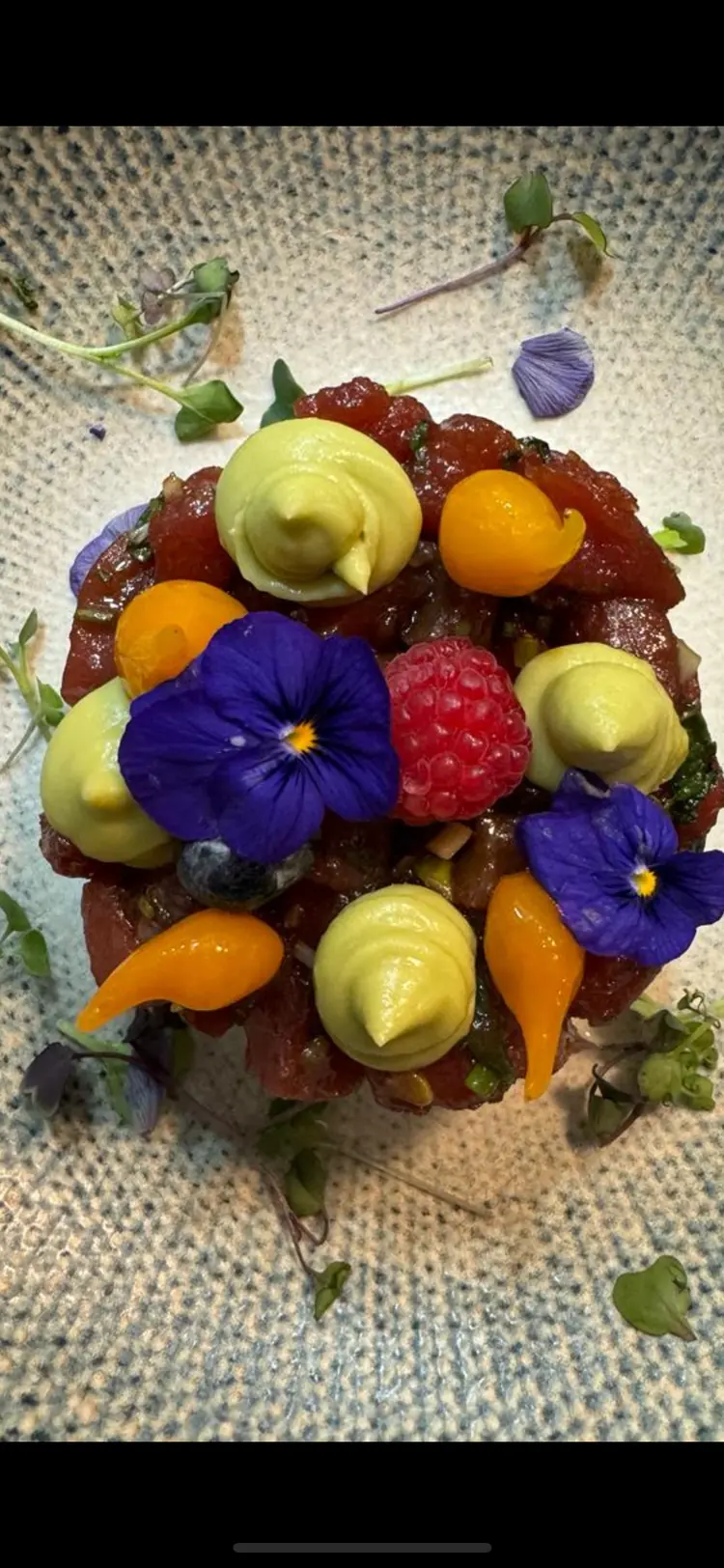 Tartar de atun rojo salvaje de la almadraba con aguacate y menta al estilo de Favignana (Sicilia).