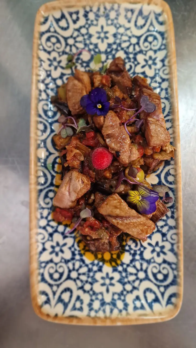 Pisto de berenjena a la siciliana con atun rojo de almadrava en agridulce.
