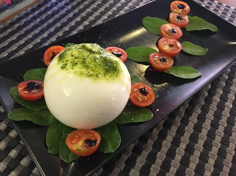 Queso fresco cremoso con tomate natural «selección especial» , toque de pesto de Albahaca . Contiene lácteos y frutos secos.