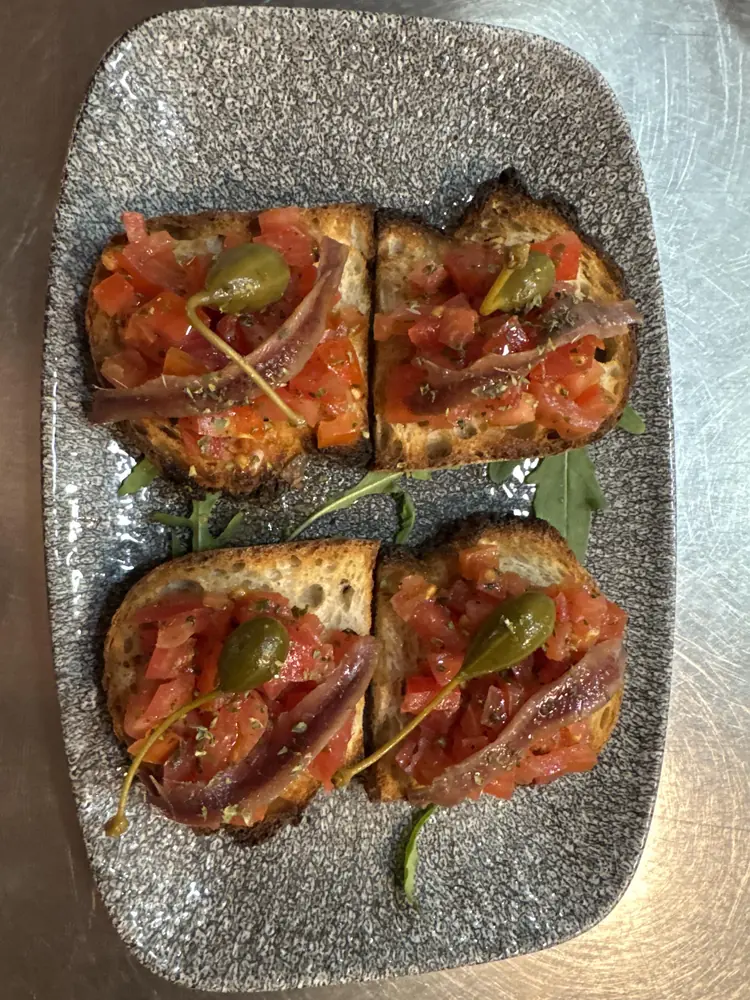 Pan de pueblo artesanal tostado, con tomte natural trozeado, aliñado con nuestro A.O.V.E siciliano, anchoas y alcaparrones