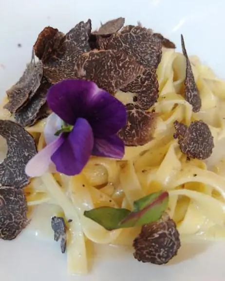 Tallarines frescos artesanales con trufa fresca natural de temporada tuber melanosporum. Contiene huevo, lácteos.